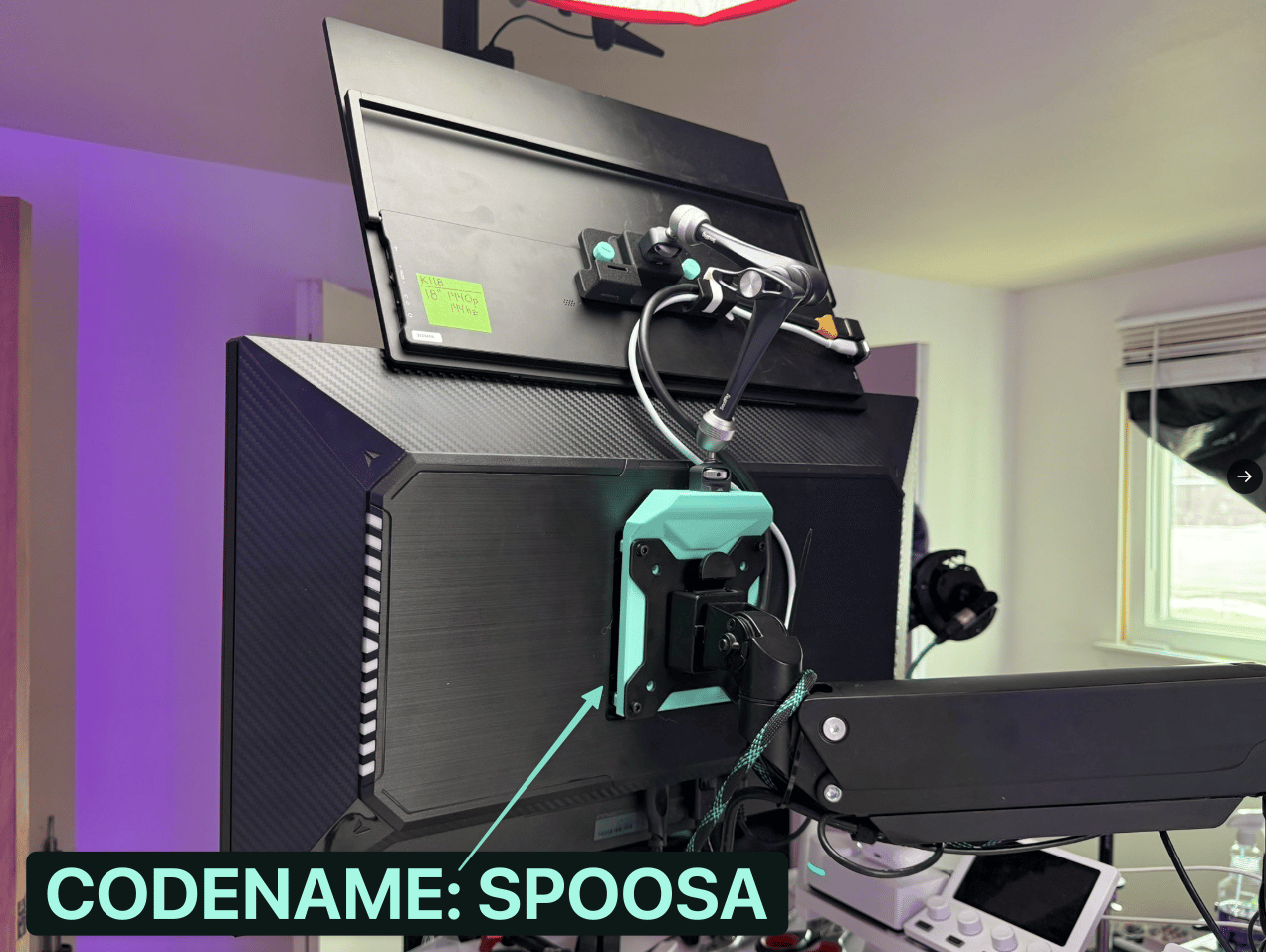 This is a spacer that goes in between your VESA arm mount plate, and your primary monitor. This gives you a 1/4” thread that you can connect a tension arm to, and then connect something else. Mics, portable monitors, XENEON edge, etc. Anything around 1lb. Below I have this Spoosa with a single smallrig ROSETTE tension arm, and the portable monitor is using one of my VESA to 1/4” adapters. If you plan to use a portable monitor for this, you’ll need to use either a portable monitor with VESA mounting holes, or some kind of universal tablet mount like this one I’ve used for my iPad. Just make sure you check the to make sure the mount opens up wide enough to wrap around the portable monitor.