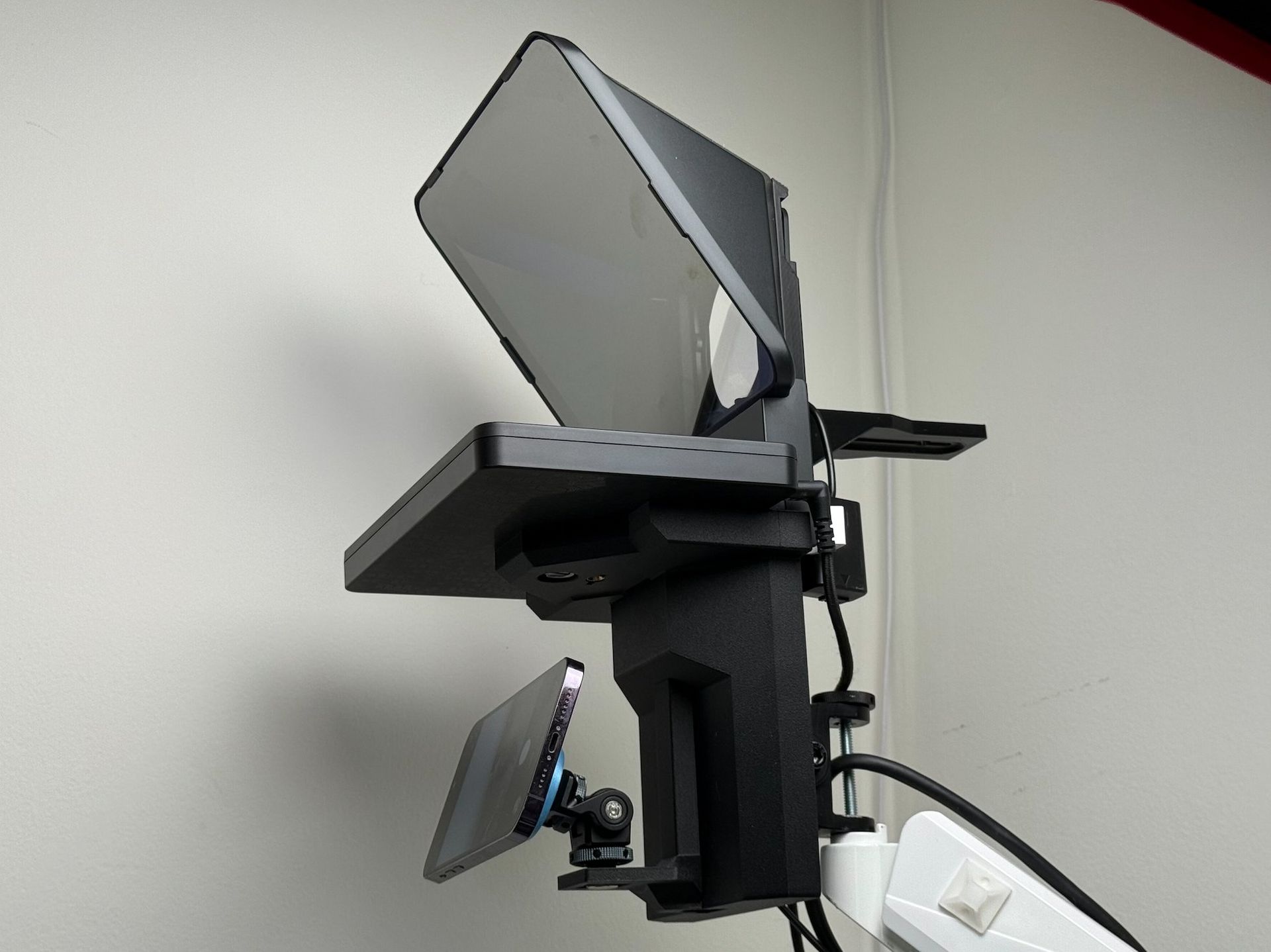 Mount your prompter onto any spare PC monitor arm and add