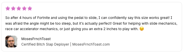 Ever felt like the Elgato stream deck pedal just wasn’t the right pedal? Ever wish you could raise it up just a ton or add some grips so it didn’t slide on the carpet so much? NOW YOU CAN. What started as a commission for streaming MosesFrnchToast turned into a full blown kit. This raises the rear of the pedal about 1.5” inches, and also provides some additional grips for people on carpet. Moses has been using it for a while now and here is what he had to say: